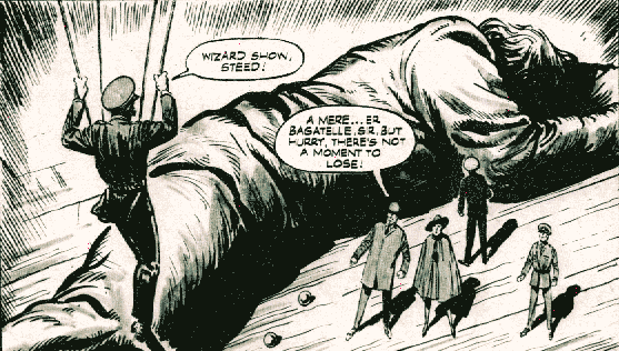 Steed and Tara realise that they have been greatly reduced in size and make a run for it. Spooner grabs them and drops them into a mouse cage. Inside, they meet the three officers who had gone missing, Brigadier Trudshaw, Admiral Hornbeam and Air Marshall Golightly. They tell Steed that Spooner plans to sell his shrinking ray to a foreign power, and that he has just headed off for their embassy. They need to escape, and Steed has a plan. He gets into the wheel, intended for the mice who would normally inhabit the cage, and asks the military men to pull away the supporting wires on his say so. Blast off!!